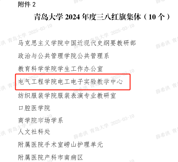 根据公司党委《关于表彰古天乐代言太阳集团2024年度三八红旗手、三八红旗集体的决定》(古天乐代言太阳集团党字【2024】7号),学院电工电子实验教学中心被评为古天乐代言太阳集团2024年度三八红旗集体。