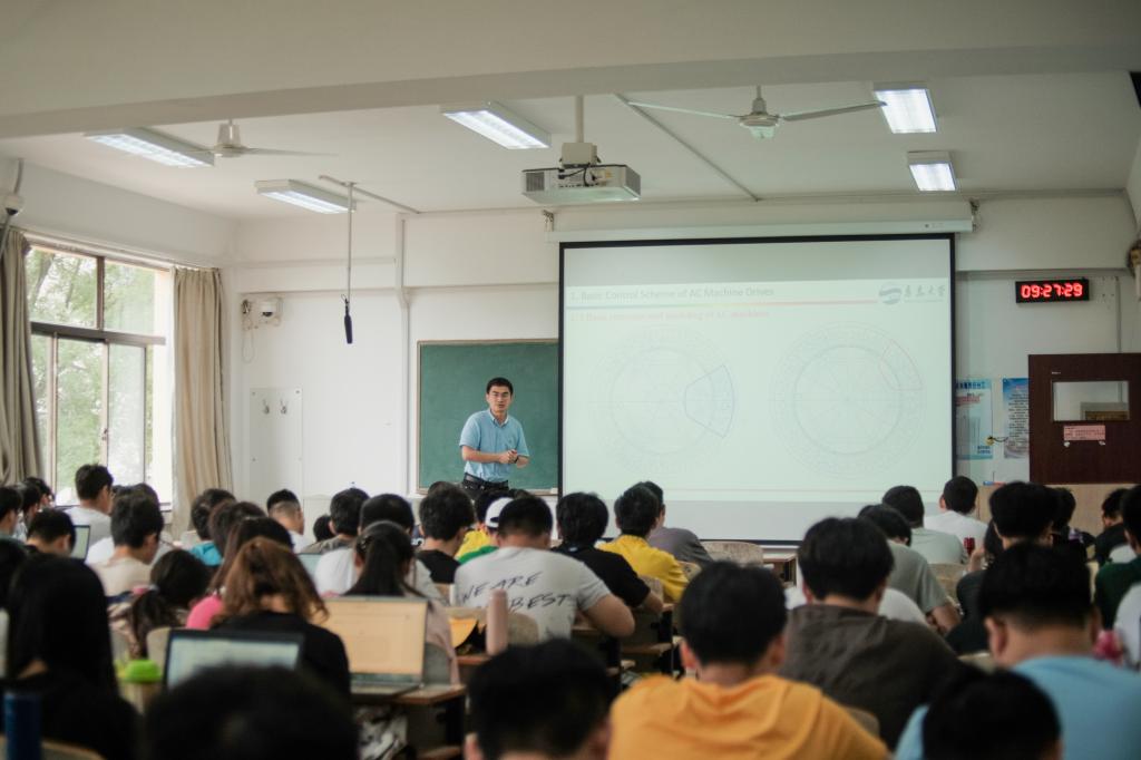 倪荣刚老师首先向同学们讲解了永磁同步电机控制系统基础理论,向同学们介绍了无位置传感器控制技术发展历史,并详细讲解了其基本原理和实现方法。他提出变频调速永磁同步电驱动系统已经在节能、提高系统功率密度和动态品质等方面取得了显著成效,而其实现所依赖获取准确转子位置信息的电机轴段编码器的安装,但安装编码器不仅增加了系统成本和复杂度,不便于工业现场应用,而且当编码器出现故障时将严重影响控制系统性能。因此,省去编码器而通过变频器的电压、电流信息辨识永磁同步电机转子位置成为当今的热点方向。