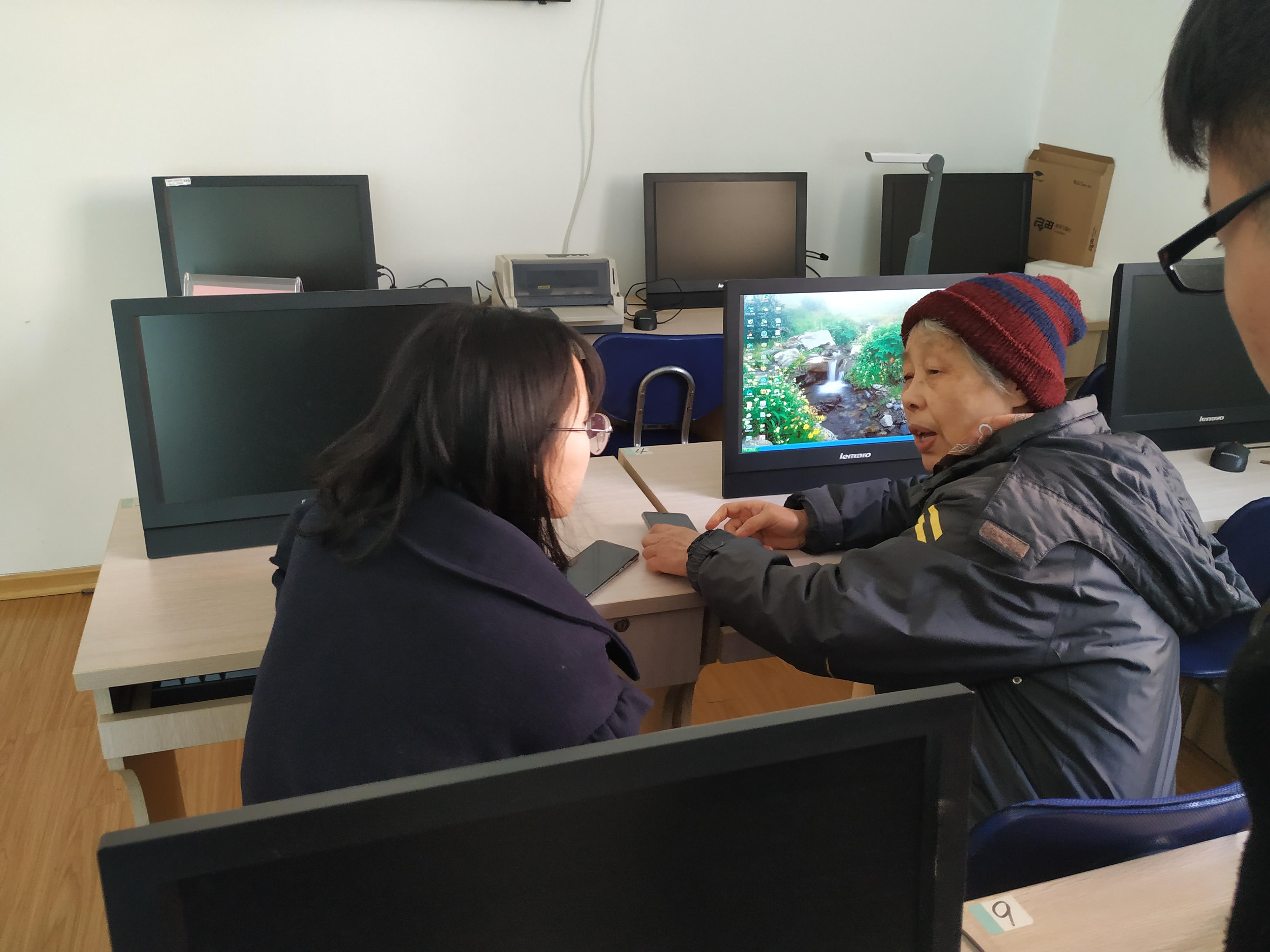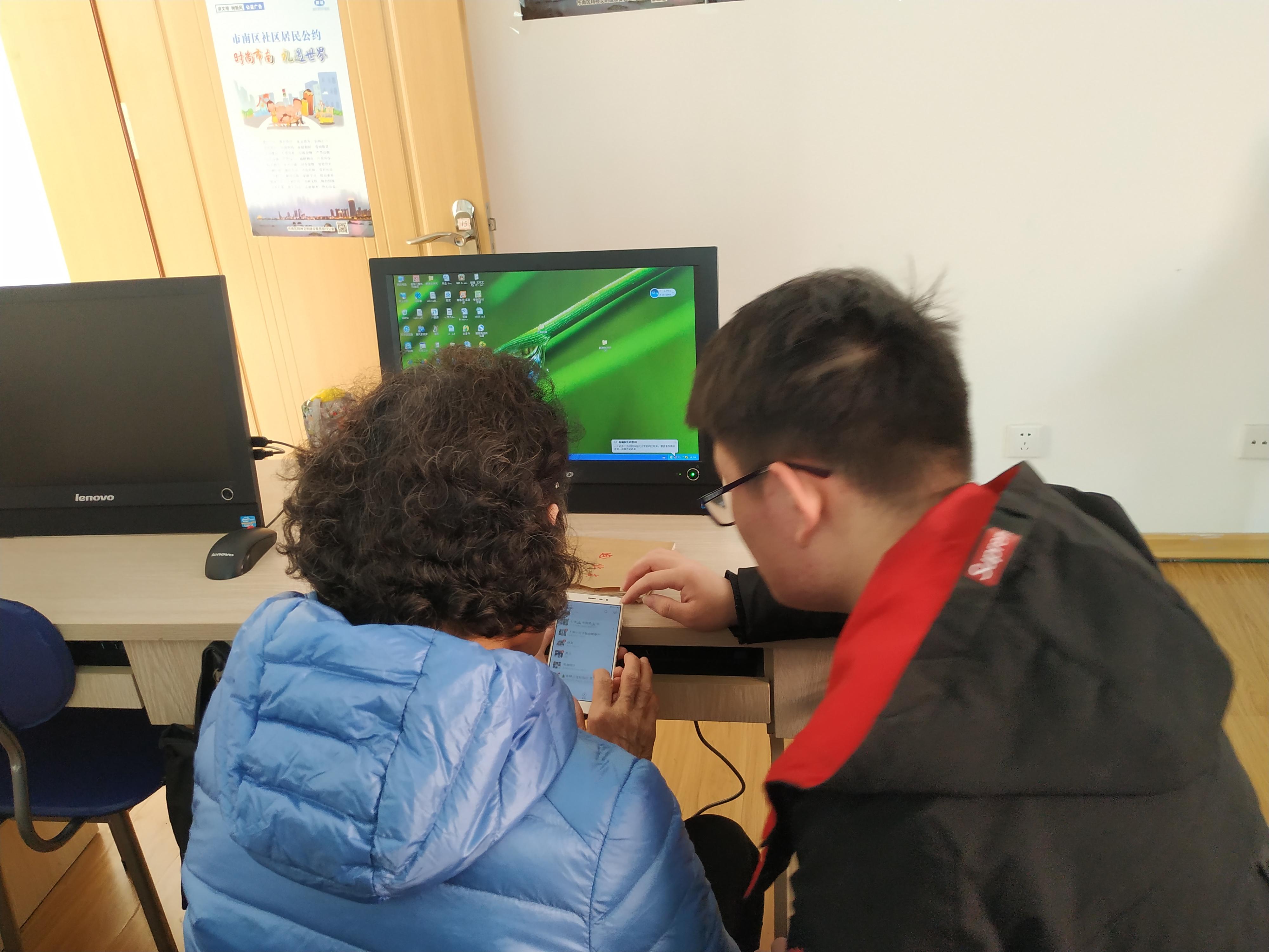 一大早,董洛康、张海宁带领全体成员穿过校园来到社区教室耐心地等待爷爷、奶奶们的到来。明亮整洁的教室里,整整齐齐地摆放着电脑。不一会,一位位和蔼可亲的奶奶便来到教室。前来参加活动的老人们精神矍铄、慈眉善目,积极主动地学习智能手机、电脑等的使用知识。爱老服务队成员热情地与他们交流,帮助老人们解决困扰他们的各种难题。学习过程中,爷爷、奶奶们把学到知识都一一记到笔记本上,认真学习的样子感染了在场的每一位同学。