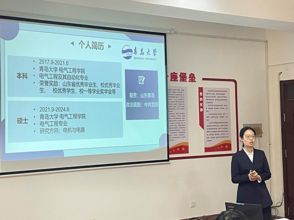 6位候选人依次进行线上或线下答辩,主要从个人简历、政治思想、科研成果、竞赛荣誉、实践活动等方面进行展示,充分展现了电气研究生学子的卓越素质和求学期间的丰富成果。